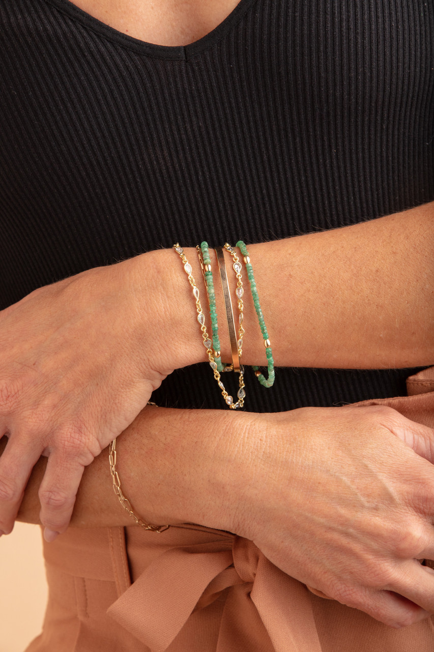 We hand-forge an 8-gauge wire and pair it with a 14k gold-filled crystal chain, delicately accented with hand-beaded raw emeralds for a warm and radiant finish.
