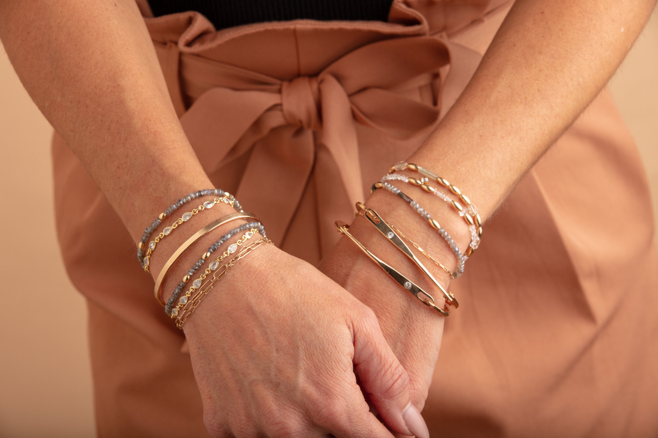 We hand-forge an 8-gauge wire and pair it with a 14k gold-filled crystal chain, delicately accented with hand-beaded labradorite for a warm and radiant finish.