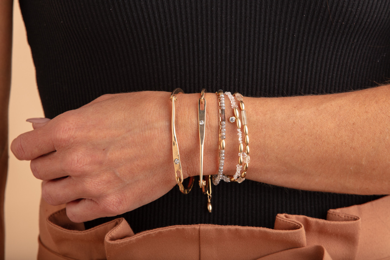 A striking bracelet showcasing a captivating blend of crystals, labradorite, tourmaline, and 14k gold-filled beads, beautifully crafted for an elegant and radiant finish.