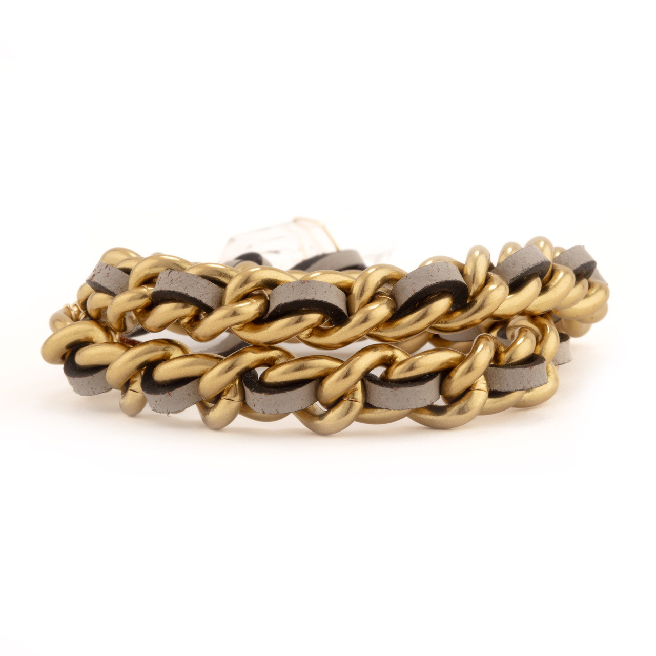 Italian leather is artfully woven with a brass chain, finished with a large quartz stone closure. Designed to be worn as either a necklace or a bracelet. 15″.