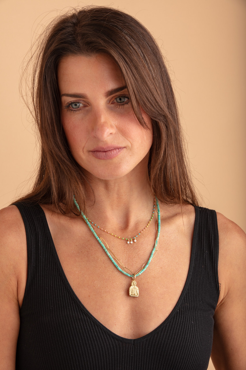 A Kingman turquoise beaded strand paired with a 14k gold-filled paperclip chain, adorned with a beautifully hand-cast owl charm. 15–17″ adjustable.