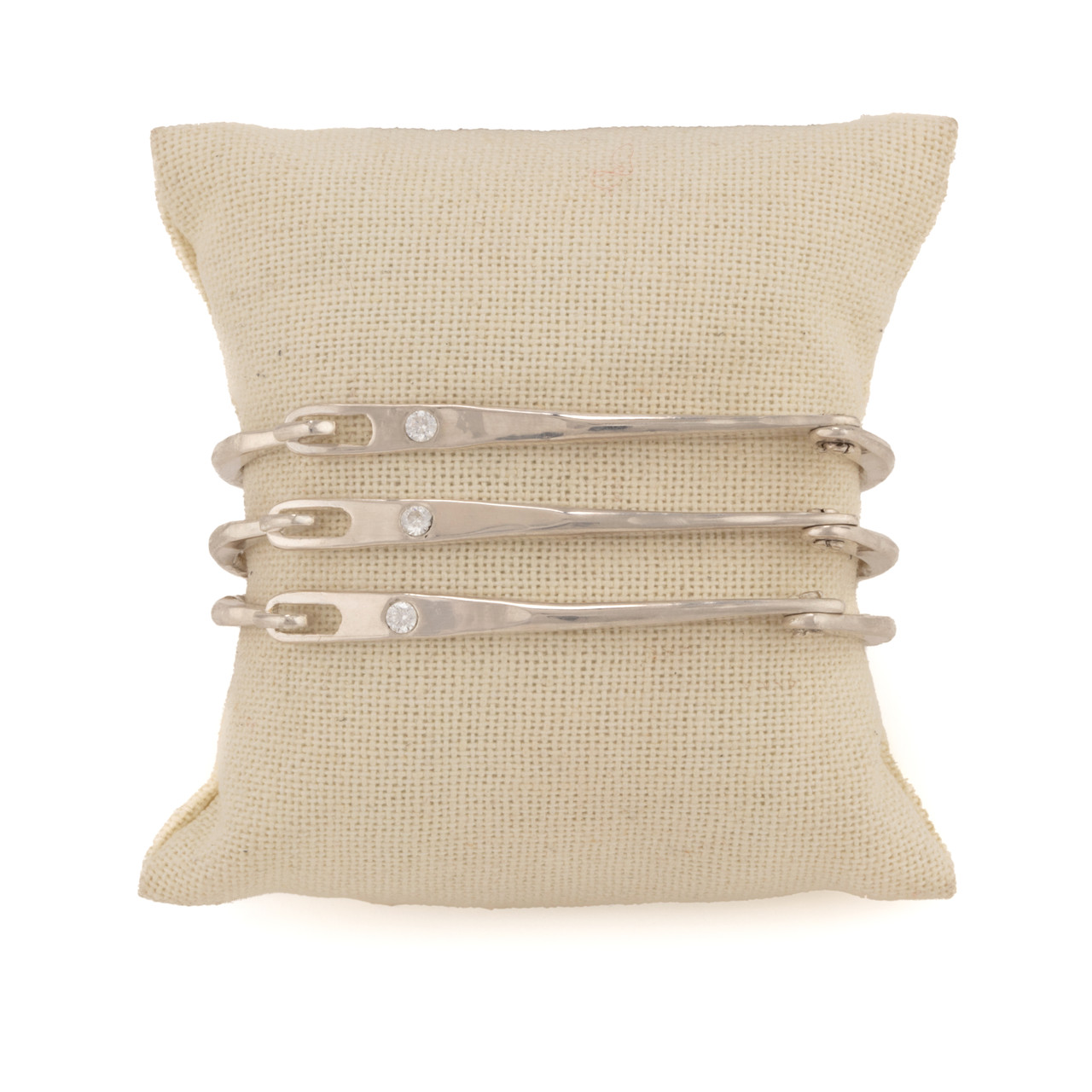 We hand-forge an 8-gauge sterling silver wire, meticulously crafting a hinged bracelet adorned with a delicate crystal inlay for a refined and timeless finish.