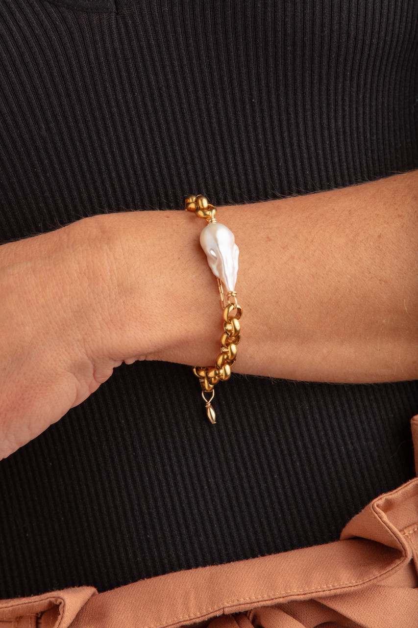 A brass rolo chain bracelet accented with a stunning baroque freshwater pearl, offering effortless elegance. Fully adjustable for your ideal fit.