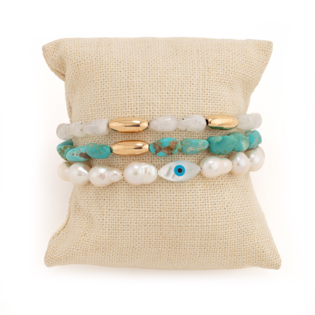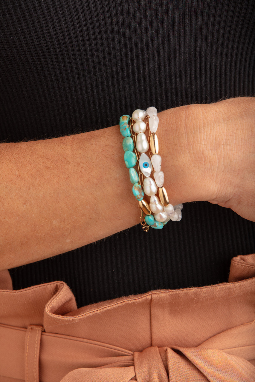 A striking bracelet showcasing a captivating blend of freshwater pearls, turquoise, and 14k gold-filled beads, centered around a mother-of-pearl protection eye, beautifully crafted for an elegant and radiant finish.